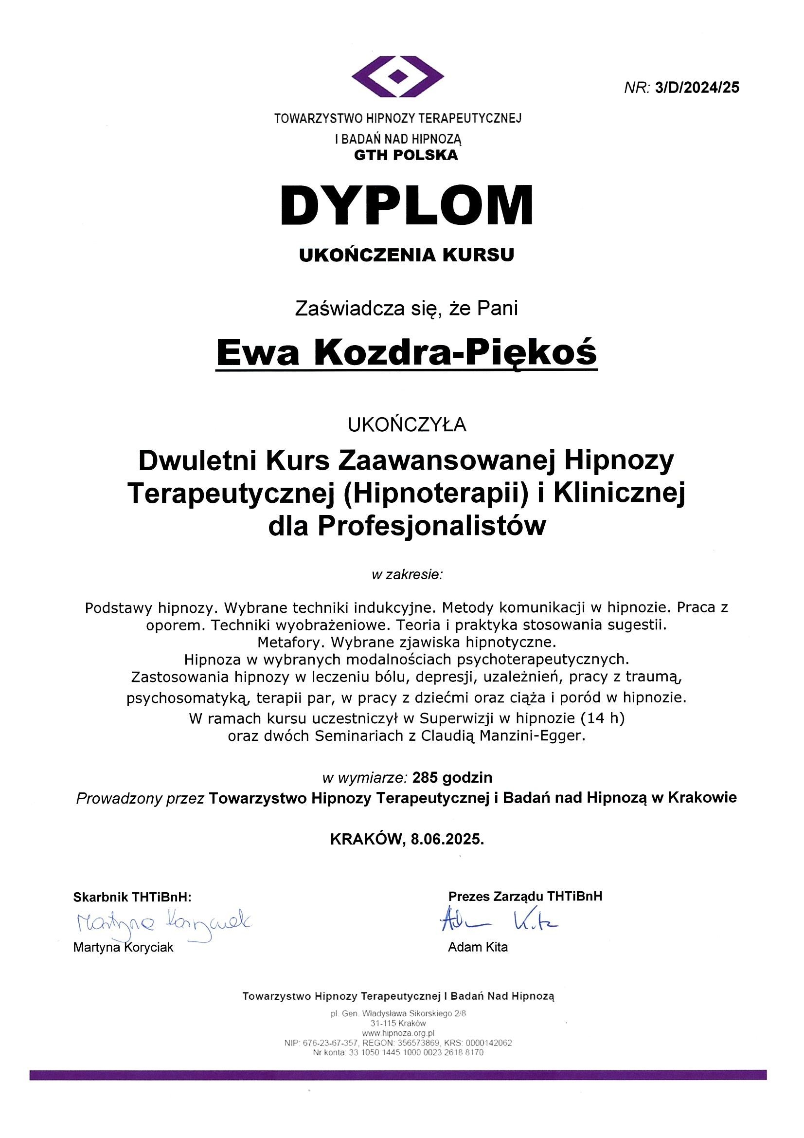 Doświadczeniowy charakter Terapii Schematu jest również podstawą hipnoterapii, co skłoniło mnie do podjęcia 4-letniego kształcenia w Towarzystwie Hipnozy Terapeutycznej i Klinicznej i Badań nad Hipnozą. Bardzo cenię hipnozę terapeutyczną za to, że uwzględnia ona znaczenie procesów nieświadomych, umożliwiając opracowanie tego, co z poziomu wglądu intelektualnego często jest niedostępne. Wbrew powszechnym wyobrażeniom praca terapeutyczna w hipnozie prowadzona przez rzetelnie wykwalifikowanego psychoterapeutę jest w pełni bezpieczna dla pacjenta, a on sam w każdym momencie ma pełną kontrolę nad tym, co dzieje się podczas sesji. Hipnoterapia pozwala na głębsze zrozumienie pacjenta przez samego siebie, a także przez terapeutę i sprzyja wzmocnieniu relacji terapeutycznej.